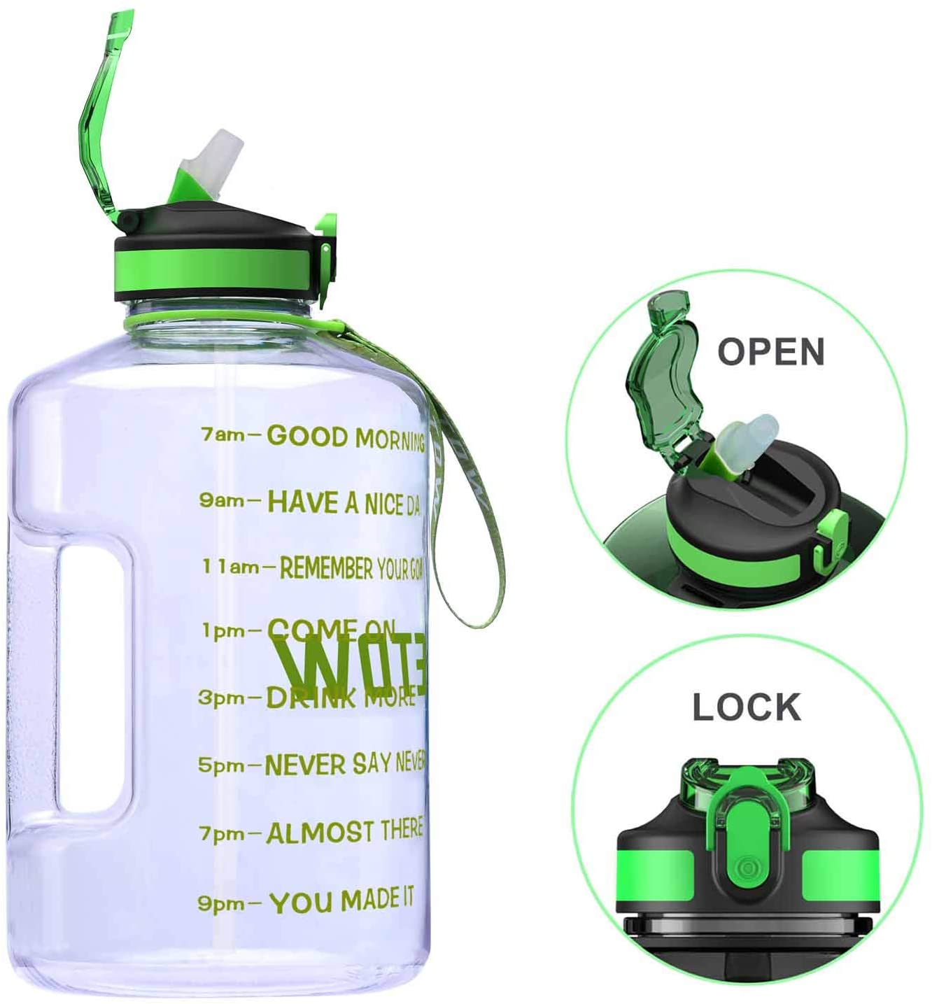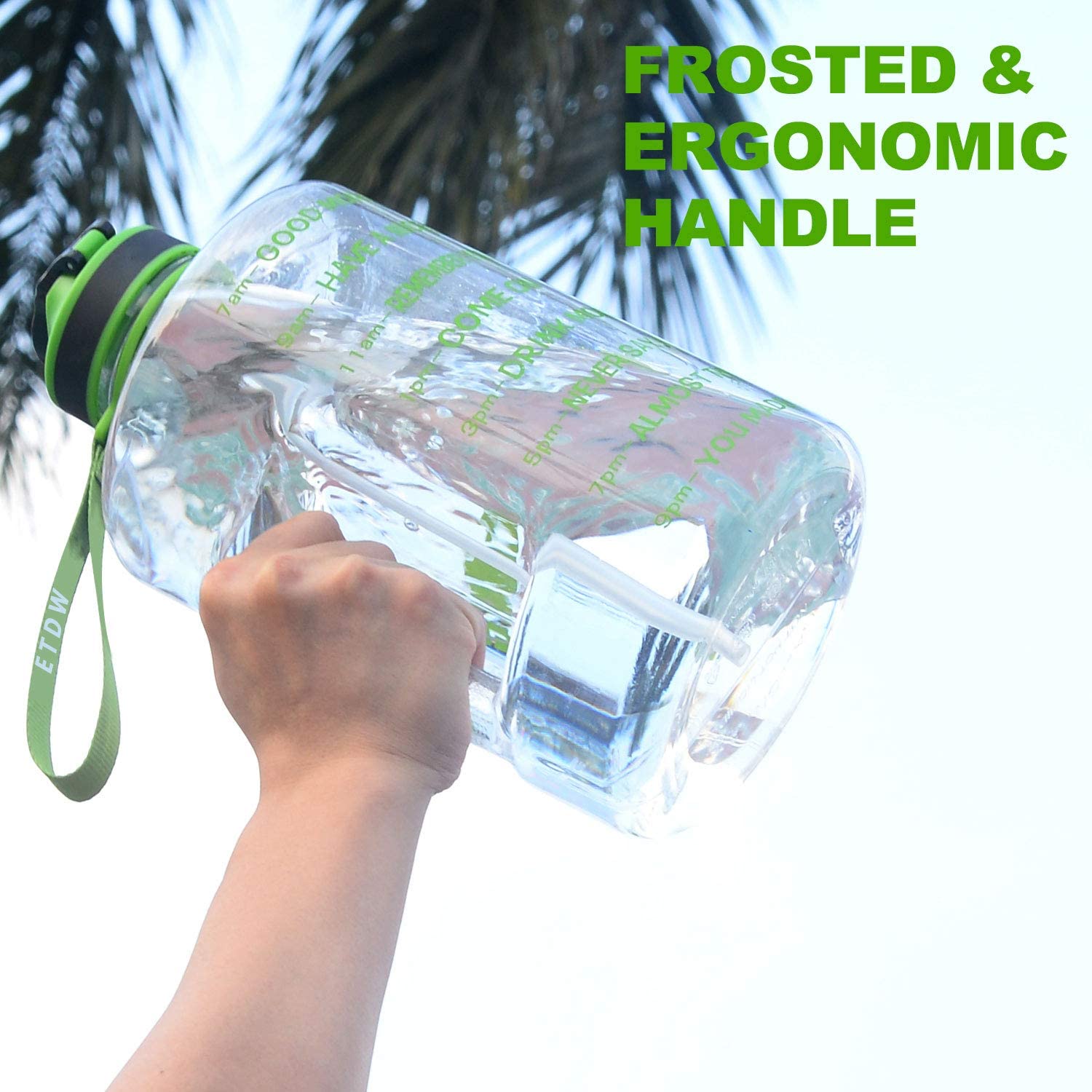 2.MOTIVATIONAL & PORTABLE JUG: The gallon water bottle with time marker was silkscreened 8-time markers from 7 am to 9 pm on the body, which will accurately remind you to drink enough water; The designed of the gym water bottle with a strong handle, nylon woven strap and 100% leak-proof lid is easy to carry to outside, gym, office, and outdoor recreations.